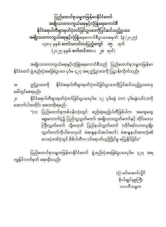 နိုင်ငံရေးပါတီများ မှတ်ပုံတင်ခြင်း ဥပဒေပုဒ်မ ၁၂၊ ပုဒ်မခွဲ (က) ၊ ပုဒ်မခွဲငယ် (၁) မှာ ပြည်ထောင်စု တစ်ဝန်းလုံးမှာ စည်းရုံးမယ့် ပါတီဖြစ်ပါက အထွေထွေရွေးကောက်ပွဲမှာ ပြည်သူ့လွှတ်တော်၊အမျိုးသားလွှတ်တော် နဲ့ တိုင်းဒေသကြီးလွှတ်တော် ဒါမှမဟုတ် ပြည်နယ်လွှတ်တော် (တိုင်းရင်းသား လူမျိုးလွှတ်တော်ကိုယ်စားလှယ် မဲဆန္ဒနယ် အပါအဝင်) မဲဆန္ဒနယ်အားလုံးရဲ့ ထက်ဝက်မှာ ဝင်ရောက်ယှဉ်ပြိုင်မှု မပြုနိုင် ဆိုတဲ့ အချက်ကို ငြိစွန်းရင် နိုင်ငံရေးပါတီအဖြစ် ဆက်လက်ရပ်တည်ပိုင်ခွင့် မရှိ လို့ ပြဋ္ဌာန်းထားချက်ကို ပြည်ထောင်စုတစ်ဝန်းလုံး စည်းရုံးမယ့် ပါတီဖြစ်ပါက မဲဆန္ဒနယ်အားလုံးရဲ့ လေးပုံတစ်ပုံ မှာ ဝင်ရောက်ယှဉ်ပြိုင်မှု မပြုနိုင် ဆိုတဲ့ အချက်ကို အစားထိုး ပြင်ဆင်တဲ့ နိုင်ငံရေးပါတီများ မှတ်ပုံတင်ခြင်း ဥပဒေကို ပြင်ဆင်တဲ့ ဥပဒေကို အမျိုးသား ကာကွယ်ရေး နှင့် လုံခြုံရေး ကောင်စီက စက်တင်ဘာ ၂၁ ရက်မှာ ပြဋ္ဌာန်းလိုက်တာဖြစ်ပါတယ်။
