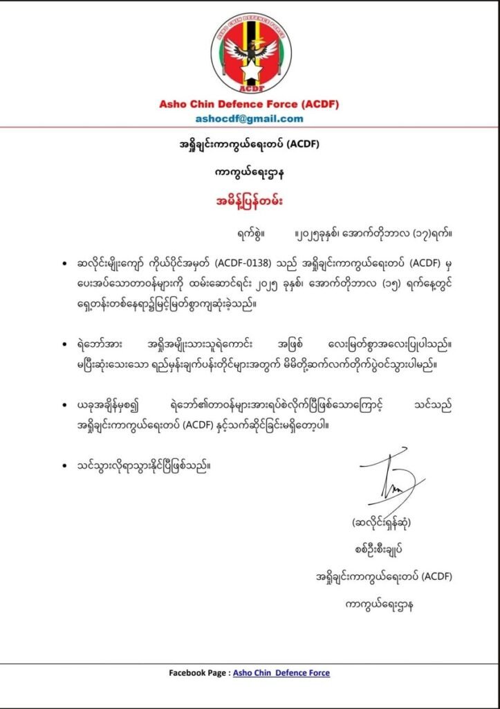အရှိုချင်းကာကွယ်ရေးတပ် (ACDF) တပ်ဖွဲ့တွင် ကိုယ်ပိုင်အမှတ် (ACDF – 0178) ဖြင့် တာဝန်ထမ်းဆောင် နေတဲ့ ဆလိုင်းထွန်းမင်းဇင် နဲ့ ကိုယ်ပိုင်အမှတ် (ACDF – 0138) ဖြင့်တာဝန်ထမ်းဆောင်နေတဲ့ ဆလိုင်းမျိုးကျော် တို့ဟာ အောက်တိုဘာလ ၁၄ ရက်နေ့နဲ့ ၁၅ ရက်နေ့တုန်းက ရှေ့တန်းတစ်နေရာမှာ မြင့်မြတ်စွာ ကျဆုံးခဲ့ရတာလို့ ထုတ်ပြန်ထားပါတယ်။