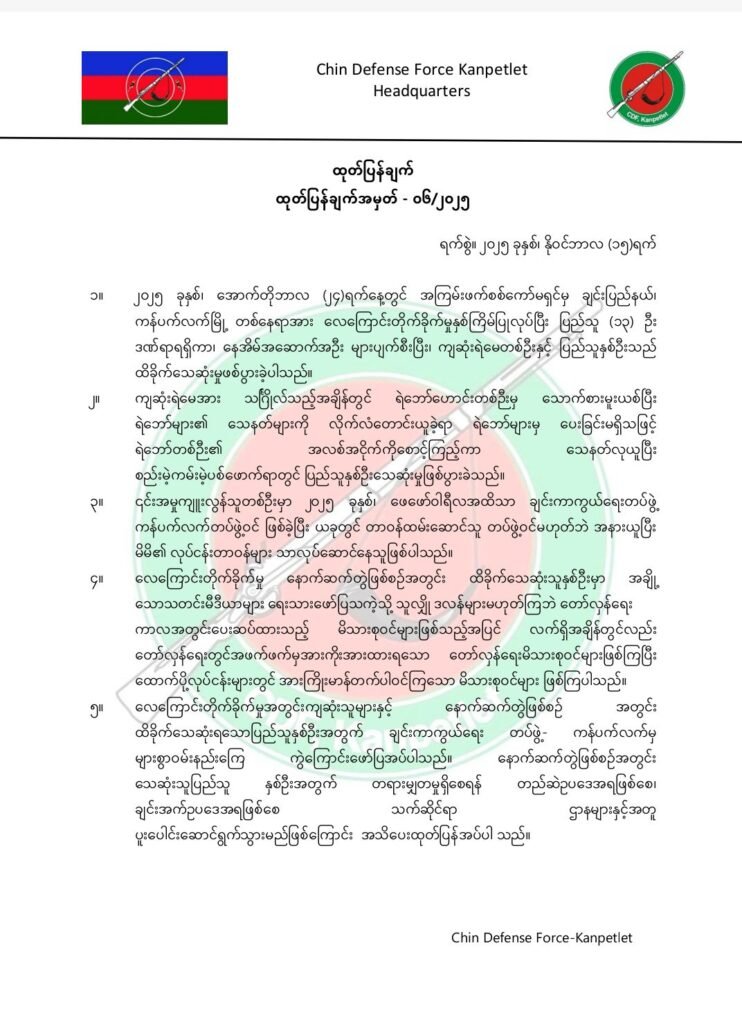 လေကြောင်းတိုက်ခိုက်မှုအတွင်းကျဆုံးသူတွေနဲ့ နောက်ဆက်တွဲဖြစ်စဉ် အတွင်း ထိခိုက်သေဆုံးရသောပြည်သူနှစ်ဦးအတွက်များစွာ ဝမ်းနည်းကြေကွဲကြောင်း၊ဒါ့အပြင် နောက်ဆက်တွဲဖြစ်စဉ်အတွင်း သေဆုံးသူပြည်သူနှစ်ဦးအတွက် တရားမျှတမှုရှိစေဖို့ တည်ဆဲဥပဒေအရဖြစ်စေ၊ ချင်းအက်ဥပဒေအရဖြစ်စေသက်ဆိုင်ရာနဲ့ ပူးပေါင်းဆောင်ရွက်သွားမယ်လို့လည်း CDF-Kanpetlet ကအသိပေးထုတ်ပြန်ထားပါတယ်။