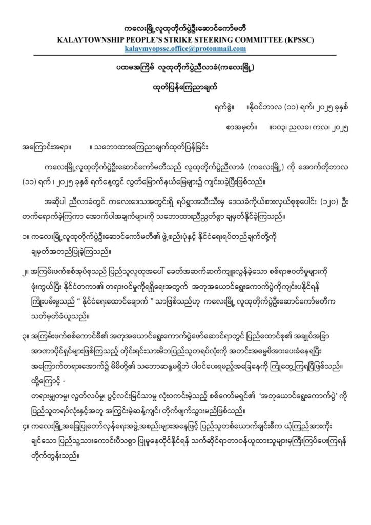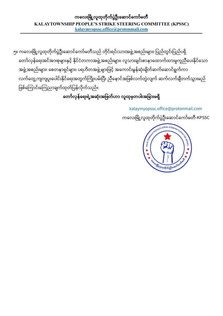 စစ်ကိုင်းတိုင်း၊ကလေးမြို့နယ်အတွင်း ပထမအကြိမ် လူထုတိုက်ပွဲ ညီလာခံကို အောက်တိုဘာလအတွင်းက ပြုလုပ်ခဲ့ပြီး ညီလာခံတက်ရောက်လာကြသူများက စစ်ကော်မရှင် ပြုလုပ်မည့် အတုအယောင် ရွေးကောက်ပွဲကို အကြွင်းမဲ့ ဆန့်ကျင်တိုက်ဖျက်သွားရန် သဘောထား ညီညွတ်စွာ ချမှတ်ခဲ့ကြောင်း ကလေးမြို့လူထုတိုက်ပွဲ ဦးဆောင်ကော်မတီက နိုဝင်ဘာလ ၁၁ ရက်မှာ ထုတ်ပြန်ထားပါတယ်။