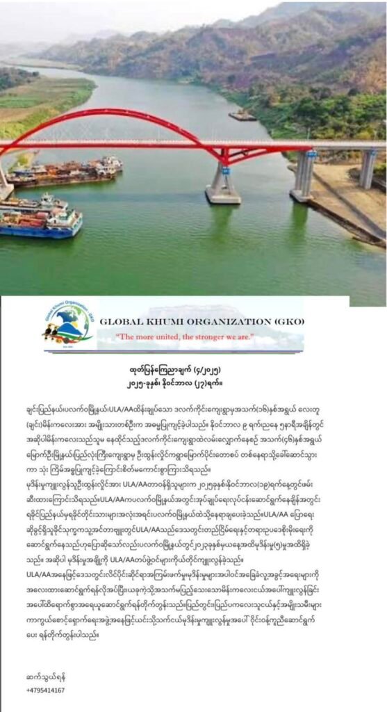 ပြီးခဲ့တဲ့ နိုဝင်ဘာလ ၉ ရက်နေ့ ၊ ညနေ ၅ နာရီချိန်လောက်မှာ ပလက်ဝမြို့နယ် ၊ ဒလက်ကိုင်းကျေးရွာက ဒေသခံ လေးတူ (ချင်း) မိန်းကလေးငယ်ကို ရခိုင်ပြည်နယ်၊ မြောက်ဦးမြို့နယ် ၊ ပြည်လုံးကြီးကျေးရွာနေ ဦးထွန်းလှိုင် အသက် ၄၆ နှစ်အရွယ်က ဒလက်ကိုင်းရွာမြောက်ပိုင်းတောစပ်တစ်နေရာမှာ အဆိုပါ ချင်းအမျိုးသမီးငယ်ကို ခေါ်ဆောင်ပြီး ၃ ကြိမ် အဓ္ဓမ္မပြုကျင့်ခဲ့တဲ့ပေါ် ULA / AA အနေဖြင့် ထိရောက်စွာ အရေးယူပေးဖို့နဲ့ ပွင့်လင်းမြင်သာမှု မရှိပဲ တရားစီရင်တဲ့အပေါ်ကိုလည်း စိုးရိမ်မှုတွေ ရှိတဲ့ကြောင်း Global Khumi Organization (GKO) အဖွဲ့က တာဝန်ရှိသူတစ်ဦးကပြောပါတယ်။