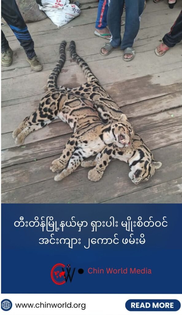 ဒီဇင်ဘာလ ၁၇ ရက်နေ့မှာ ချင်းပြည်နယ်၊တီးတိန်မြို့နယ် ပိမ်းပိကျေးရွာမှာ ဒေသခံ နှစ်ဦးက တောင်ယာ အနားထိ ရောက်ရှိလာတဲ့ ရှားပါးမျိုးစိတ်ဝင်ကျားသစ် ၂ကောင်ကို ဖမ်းမိသွားတယ် လို့ ဒေသခံတွေ ထံမှ သိရှိရ ပါတယ်။