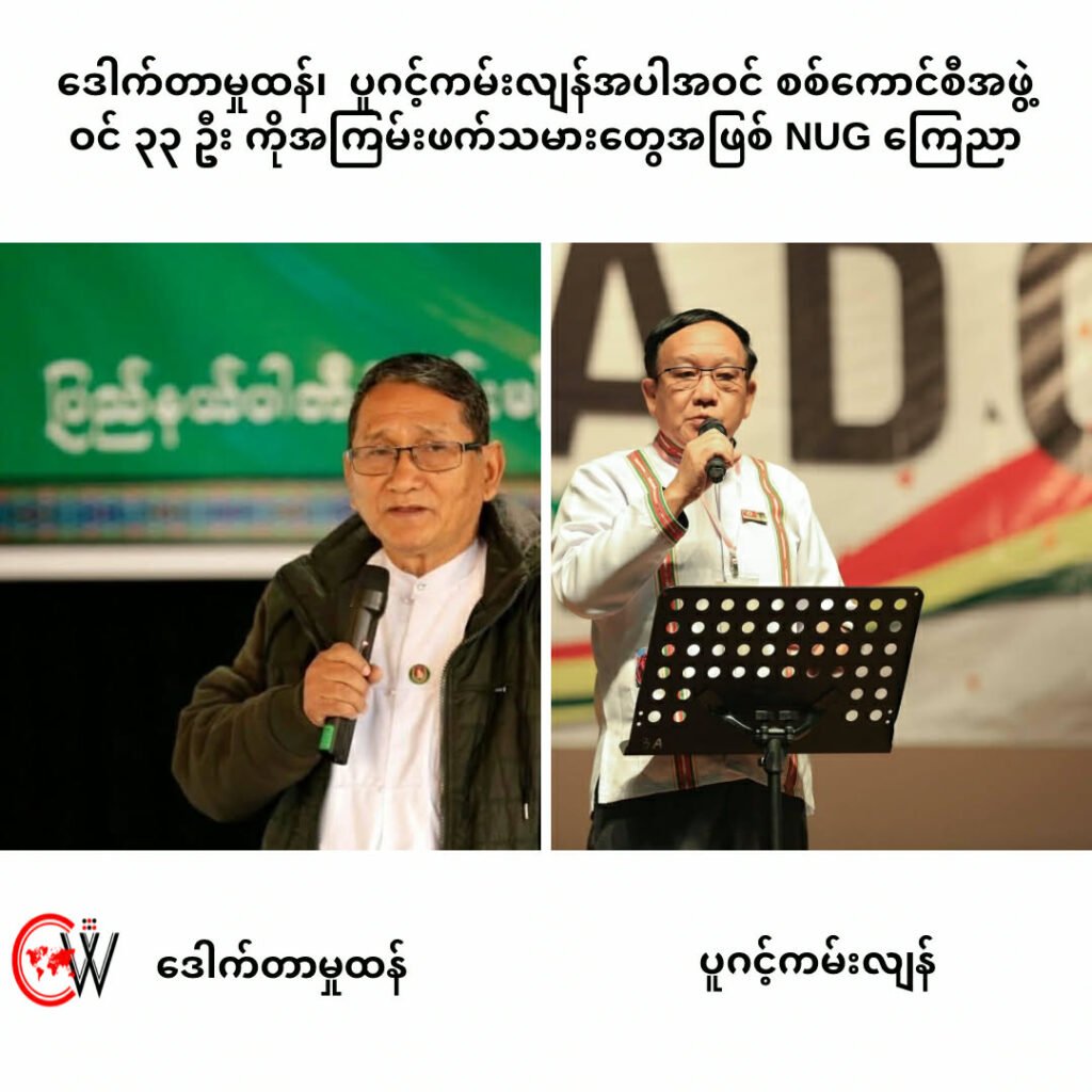စစ်ကောင်စီအဖွဲ့ဝင်အဖြင့် ခန့်အပ်ခြင်းခံရတဲ့ ဒေါက်တာမှုန်ထန်၊ ပူဂင့်ကမ်းလျန် တို့လို ချင်းတိုင်းရင်းသားတွေ လည်း NUG ကြေညာတဲ့ အကြမ်းဖက်သမားစာရင်းမှာ ပါရှိတာတွေ့ရပြီး ၎င်းတို့ကို ဖမ်းဆီးရမိနိုင်ရေးအတွက်လည်း ကြိုးပမ်း ဆောင်ရွက်သွားမှာဖြစ်တယ်လို့ NUG က ထုတ်ပြန်ပါတယ်။