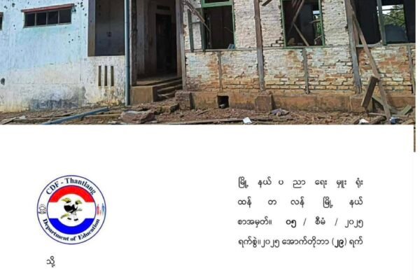 အောက်တိုဘာလ ၃၀ ရက်။ စစ်ကော်မရှင်တပ်ရဲ့ လေကြောင်းရန်ကြောင့် ချင်းပြည်နယ် ၊ ထန်တလန်မြို့နယ်အတွင်းရှိ အထက်တန်းကျောင်း၊ အလယ်တန်းကျောင်း၊ မူလတန်းကျောင်းတွေ အားလုံး အကန့်အသတ်မရှိ ပိတ်ထားဖို့ CDF –Thantlangရဲ့ ပညားရေးဌာန က အောက်တိုဘာလ ၂၉ ရက်နေ့မှာ ထုတ်ပြန်ထားပါတယ်။ စစ်ကော်မရှင်တပ်ဖွဲ့ဟာ နေ့စဉ် လူနေအိမ်နှင့် စာသင်ကျောင်းတွေကို လေကြောင်းကနေ ဗုံးကြဲတိုက်ခိုက်နေတာကြောင့် အခုလို စာသင်ကျောင်းတွေ အားလုံးပိတ်ဖို့ လုပ်ဆောင်ရတာလို့လည်း ဖော်ပြထားတာတွေ့ရပါတယ်။ ပြီးခဲ့တဲ့ အောက်တိုဘာလ ၁၃ ရက်နေ့ကလည်း ဟားခါးမြို့နယ် ဗန်ဟားကျေးရွာရှိ စာသင်ကျောင်းကို စစ်ကော်မရှင်က လေကြောင်းကနေ ဗုံးကြဲတိုက်ခိုက်ခဲ့လို့ ကျောင်းသား ၂ ဦးသေဆုံးခဲ့ပြီး လူအမြောက်အများ ထိခိုက်ဒဏ်ရာရခဲ့ပါတယ်။ စစ်ကော်မရှင်တပ်ဖွဲ့ဟာ အောက်တိုဘာလအတွင်း ချင်းပြည်နယ်အတွင်းရှိ တော်လှန်ရေးတပ်ဖွဲ့တွေ ထိန်းချုပ်ထားတဲ့ နေရာဒေသတွေကို လေကြောင်းကနေ…