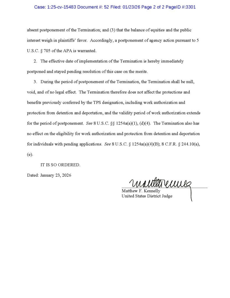 ဇန်နဝါရီလ ၂၃ ရက်နေ့မှာ တရားသူကြီး Matthew F. Kennelly ချမှတ်လိုက်တဲ့ အမိန့်အရ အစိုးရရဲ့ အကြောင်းပြချက်ဟာ မြေပြင်က အခြေအနေမှန် (ဥပမာ – မြို့နယ် ၃၂၁ မြို့နယ်မှာ အကြမ်းဖက်မှုတွေ ရှိနေခြင်း) ကို လျစ်လျူရှုထားတဲ့အတွက် “ဥပဒေနှင့် မညီညွတ်” ဘူးလို့ ဆုံးဖြတ်ခဲ့ပါတယ်။ ဒါကြောင့် ရပ်ဆိုင်းမယ့် အစီအစဉ်ကို အခုလို ယာယီ တားမြစ်ပေးလိုက်တာ ဖြစ်ပါတယ်။