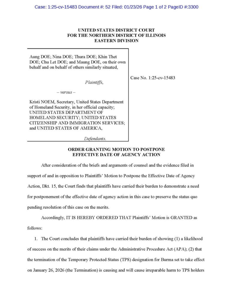 ဒီအမှုကို Aung Doe et al. v. Noem ဆိုတဲ့ အမည်နဲ့ မြန်မာနိုင်ငံသားတွေက အမေရိကန် ပြည်ထဲရေးဌာန၊ Department of Homeland Security (DHS) ကို တရားစွဲဆိုခဲ့တာ ဖြစ်ပါတယ်။ အီလီနွိုင်းပြည်နယ် မြောက်ပိုင်းခရိုင် တရားရုံးက တရားသူကြီး Matthew F. Kennelly က မြန်မာနိုင်ငံအတွင်းက မြို့နယ်ပေါင်း ၃၂၁ မြို့နယ်မှာ အကြမ်းဖက်မှုတွေ ဖြစ်နေတဲ့ အခြေအနေမှန်ကို အစိုးရဘက်က လျစ်လျူရှုပြီး ဥပဒေမဲ့ လုပ်ဆောင်ခဲ့တယ်ဆိုတဲ့ အချက်ကို အသိအမှတ်ပြုခဲ့တာပါ။