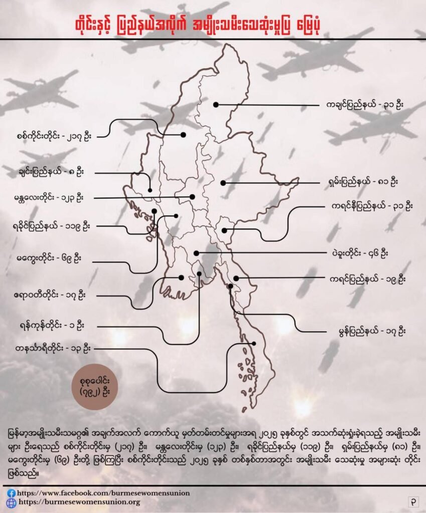 မြန်မာနိုင်ငံမှာ အာဏာသိမ်း စစ်ကော်မရှင် လက်ချက်ကြောင့် ၂၀၂၅ ခုနှစ်၊ တစ်နှစ်တာအတွင်း အမျိုးသမီး (၇၉၂) ဦးသေဆုံးခဲ့ရတဲ့အထဲ ချင်းပြည်နယ်က အမျိုးသမီး (၈) ဦးလည်း ပါဝင်တယ်လို့ မြန်မာ့အမျိုးသမီးသမဂ္ဂ(BWU) ရဲ့ ဇန်နဝါရီလ ၁၅ ရက်နေ့ ထုတ်ပြန်ချက်အရ သိရပါတယ်။