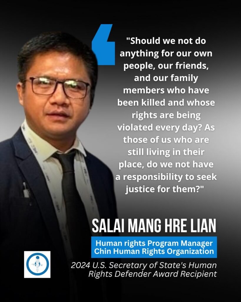 အဖြေ ။ နောက်ဆုံးအနေနဲ့ ကျွန်တော်တို့ CHRO ကရော၊ တရားမျှတမှုကို ရှာဖွေနေကြတဲ့သူတွေကရော ပြောချင်တာကတော့ ကျွန်တော်တို့ရဲ့ ချင်းလူထုနဲ့ မြန်မာတစ်နိုင်ငံလုံးက လူထုတွေ၊ မိသားစုဝင်တွေဟာ နေ့စဉ်နဲ့အမျှ အသက်သေဆုံးမှုတွေ၊ လူ့အခွင့်အရေး ချိုးဖောက်မှုတွေကို ရင်ဆိုင်နေရပါတယ်။ အဲဒီလို ခံစားနေရတဲ့သူတွေအတွက် ဘာမှလုပ်မပေးဘဲ နေလို့မရပါဘူး။ အသက်ရှင်ကျန်ရစ်တဲ့ ကျွန်တော်တို့မှာ သူတို့အတွက် တရားမျှတမှု ရှာဖွေပေးဖို့ တာဝန်ရှိပါတယ်။ ဒါကြောင့် ကလေးသူငယ်တွေရော၊ သက်ကြီးရွယ်အိုတွေပါမကျန် အသတ်ခံနေရတဲ့သူတွေအတွက် အမြဲတမ်း ကိုယ်စားပြုပြီး တရားမျှတမှုရအောင် ဆောင်ရွက်သွားမယ်ဆိုတဲ့ စိတ်ဆန္ဒကို အမြဲတမ်း သတိမူစေချင်ပါတယ်။