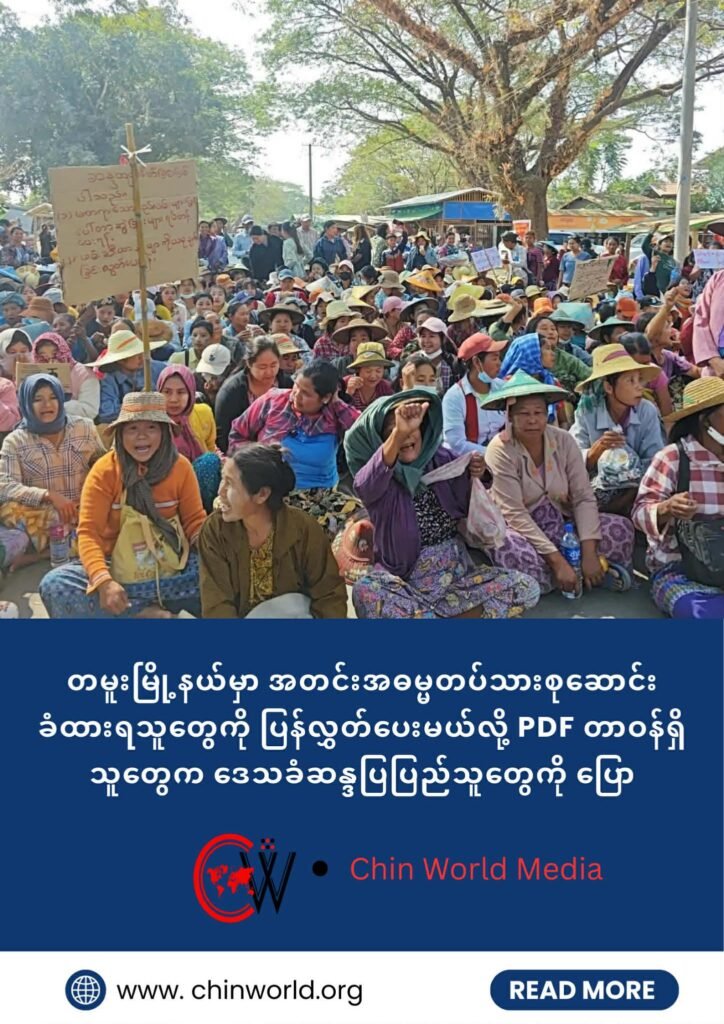 အိန္ဒိယ – မြန်မာနယ်စပ် စစ်ကိုင်းတိုင်း၊ တမူးမြို့နယ်မှာ အတင်းအဓမ္မတပ်သားစုဆောင်းခံထားရသူတွေကို ပြန်လွှတ်ပေးမယ်လို့ အမျိုးသားညီညွှတ်ရေး အစိုးရ (NUG) လက်အောက်ခံ ပြည်သူ့ကာကွယ်ရေးတပ်ဖွဲ့(PDF)တပ်ဖွဲ့ တာဝန်ရှိသူတွေက ဒေသခံ ဆန္ဒပြပြည်သူတွေကို ပြောထားကြောင်း ဒေသခံတွေက ပြောပါတယ်။