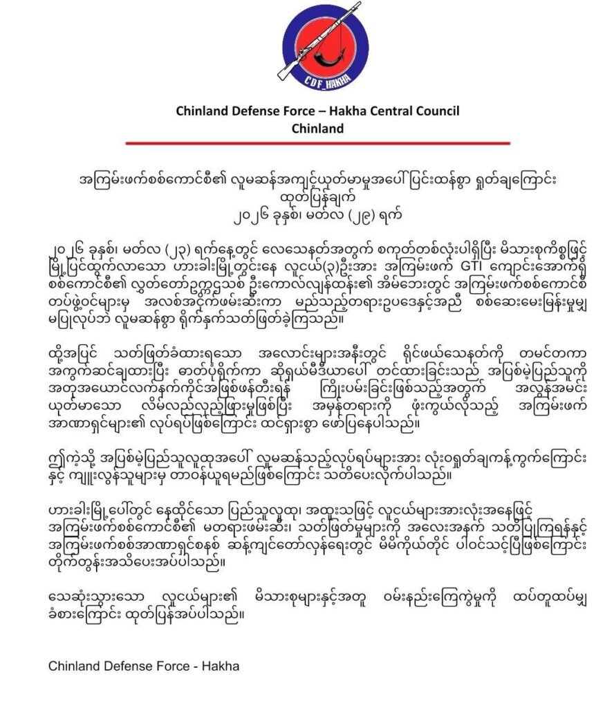 ချင်းပြည်နယ်မြို့တော် ဟားခါးမြို့တွင် မိသားစုကိစ္စဖြင့် မြို့ပြင်ထွက်လာသည့် ဒေသခံလူငယ် ၃ ဦးကို စစ်ကော်မရှင်တပ်ဖွဲ့ဝင်များက ဖမ်းဆီးပြီးနောက် မည်သည့်တရားဥပဒေနှင့်မျှ ညီညွတ်ခြင်းမရှိဘဲ လူမဆန်စွာ ရိုက်နှက်နှိပ်စက်သတ်ဖြတ်ခဲ့သည့် လုပ်ရပ်အပေါ် ပြင်းထန်စွာ ရှုတ်ချကြောင်း ဟားခါးမြို့နယ်မှာ စစ်ရေးလှုပ်ရှားနေတဲ့ ချင်းလက်နက်ကိုင်တော်လှန်ရေးအဖွဲ့ဖြစ်တဲ့ Chinland Defense Force – Hakha (CDF-Hakha) က မတ်လ ၂၉ ရက်နေ့တွင် ထုတ်ပြန်ပါတယ်။